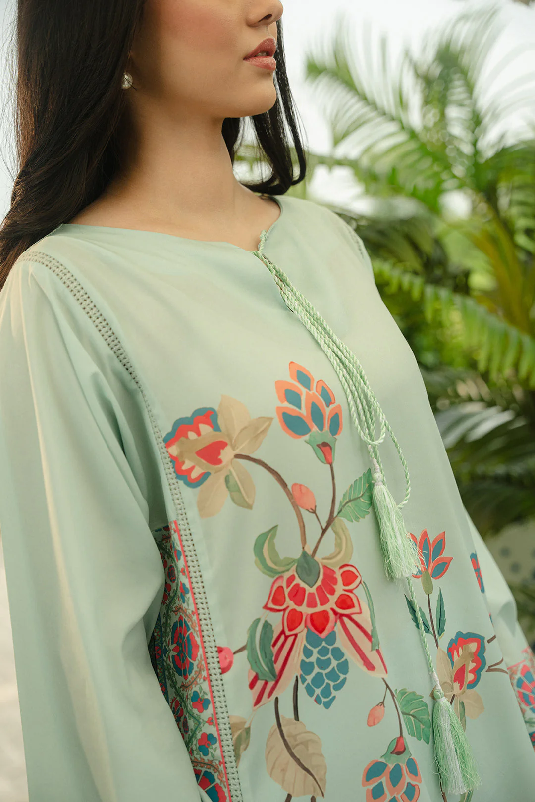 - This green top made in soft crepe fabric in floral print features boat neckline with front v-neck & tassles detail, it has square armholes, side slits, full-length sleeves with lace detail along the opening and side slits.