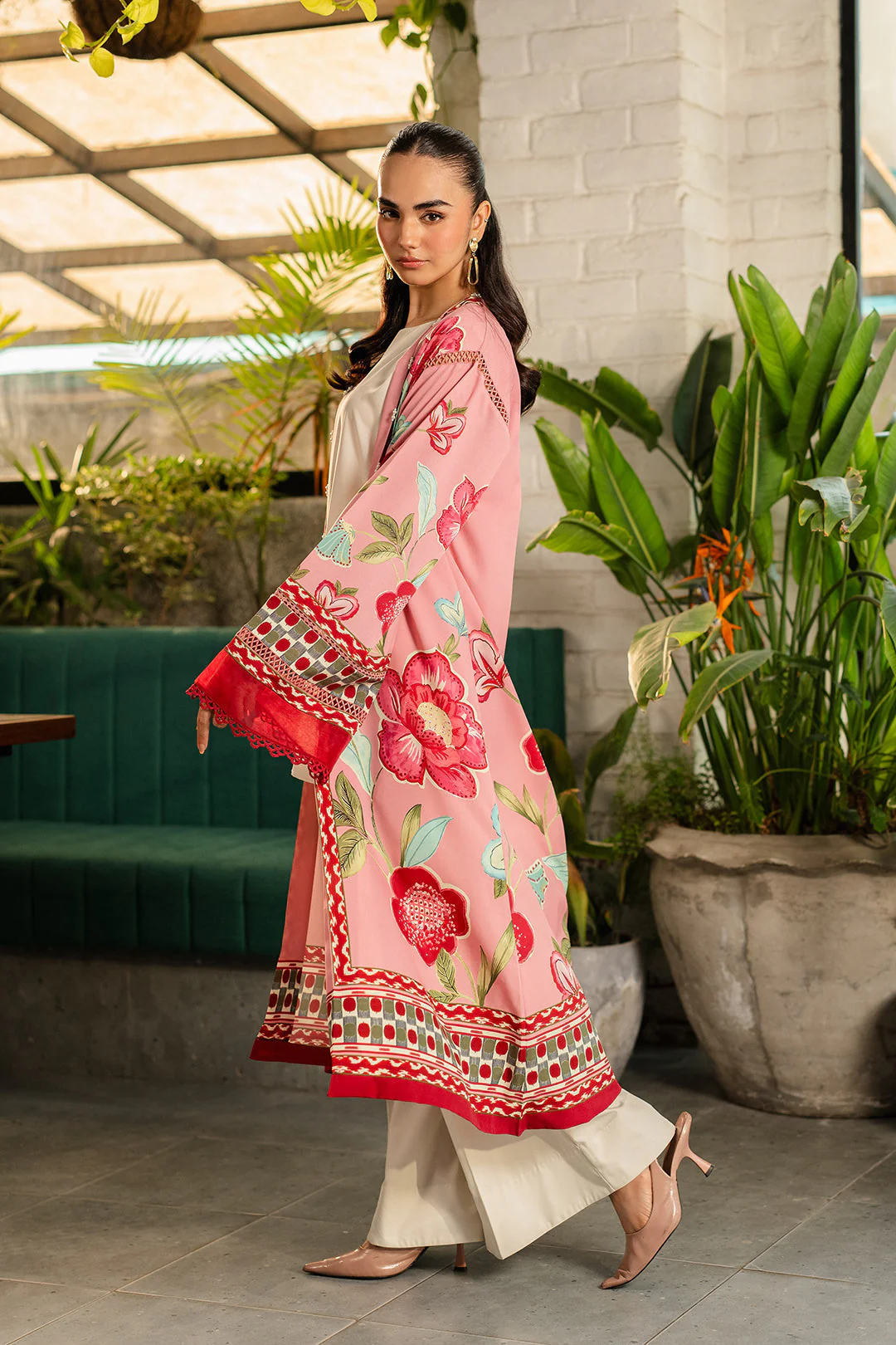 - This shrug made in pink soft crepe fabric in floral print features front open silhouette with pearl embellishment, square armholes with lace insertions, full length flared sleeves with organza cuffs.