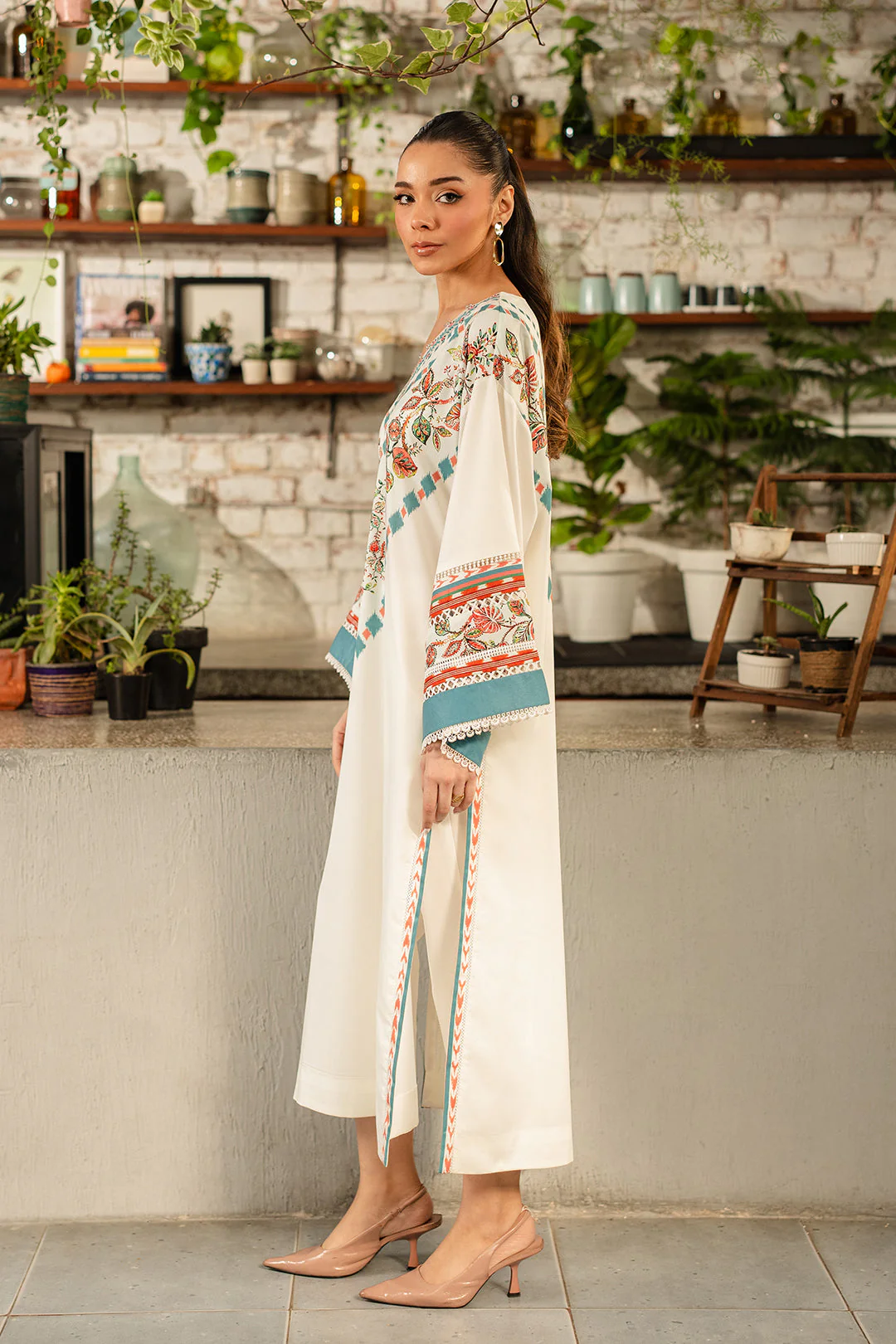- This top made in white soft crepe fabric in floral print features V-neck, with embroidered organza insertion and crystal detail, drop shoulder, full length flared sleeves, side slits. Lace insertions in side slits and sleeves.