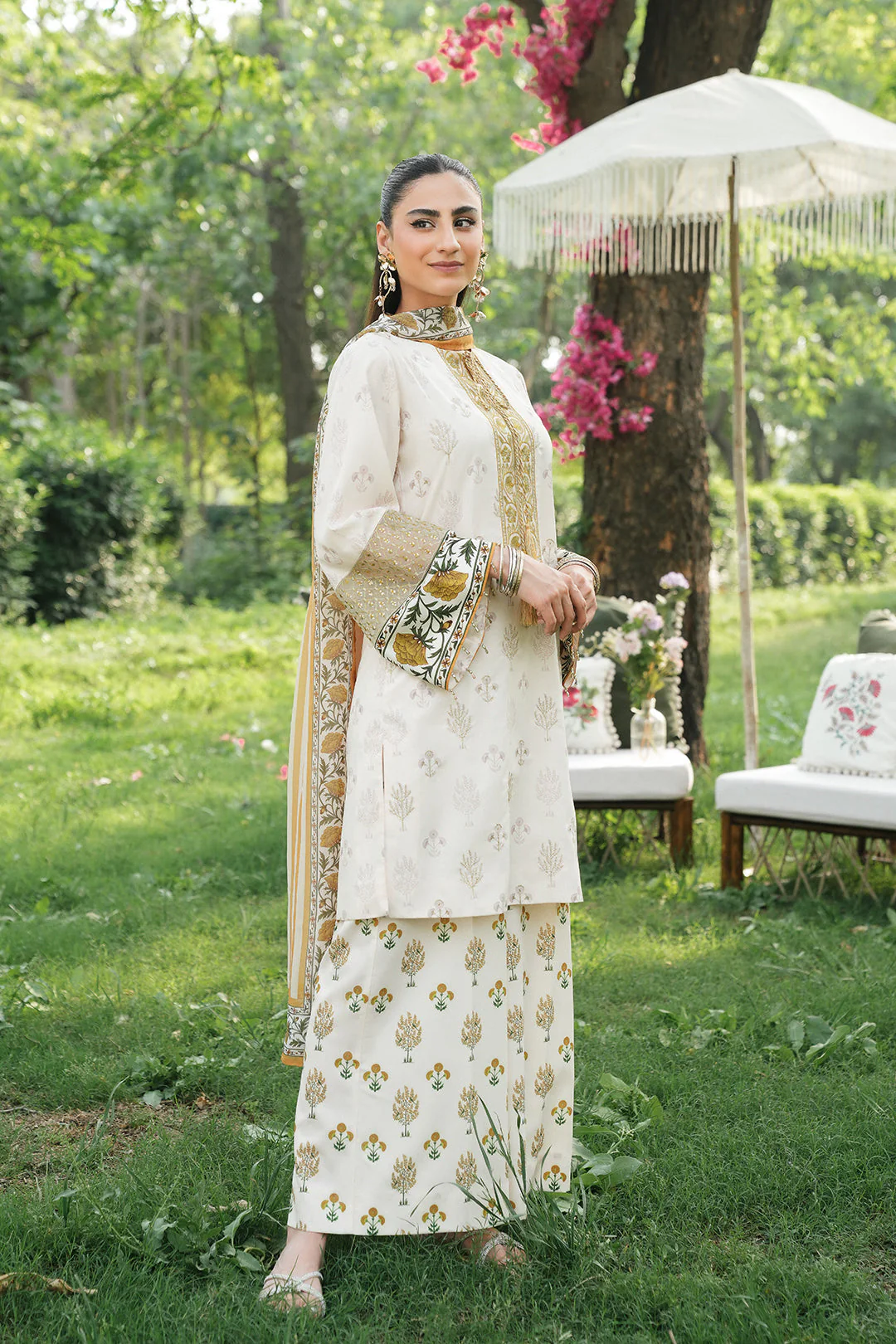 - This mustard dupatta made in soft silk fabric in floral print can be paired with "Suzil Top" to complete the look.